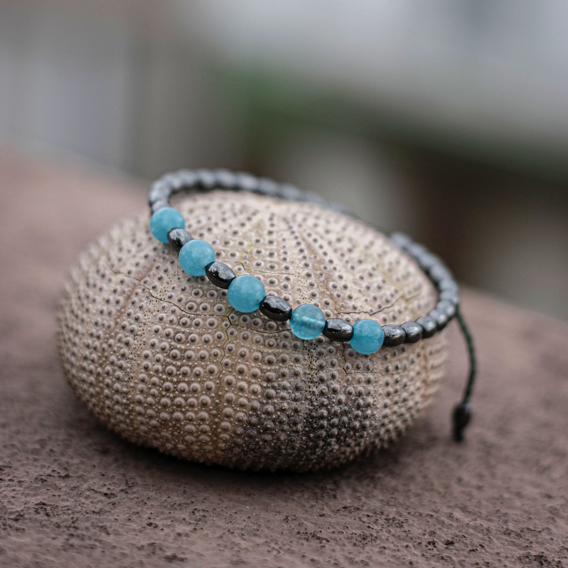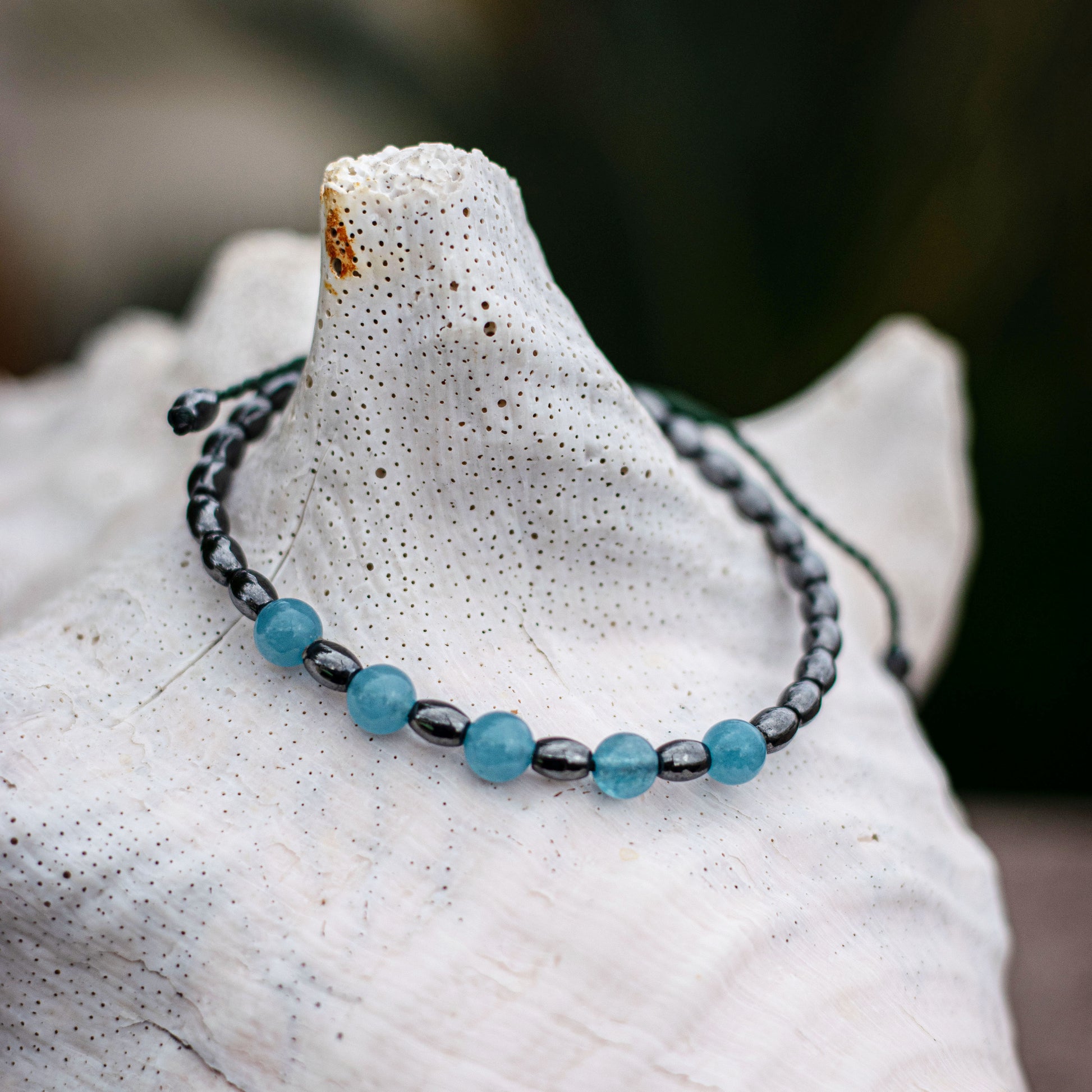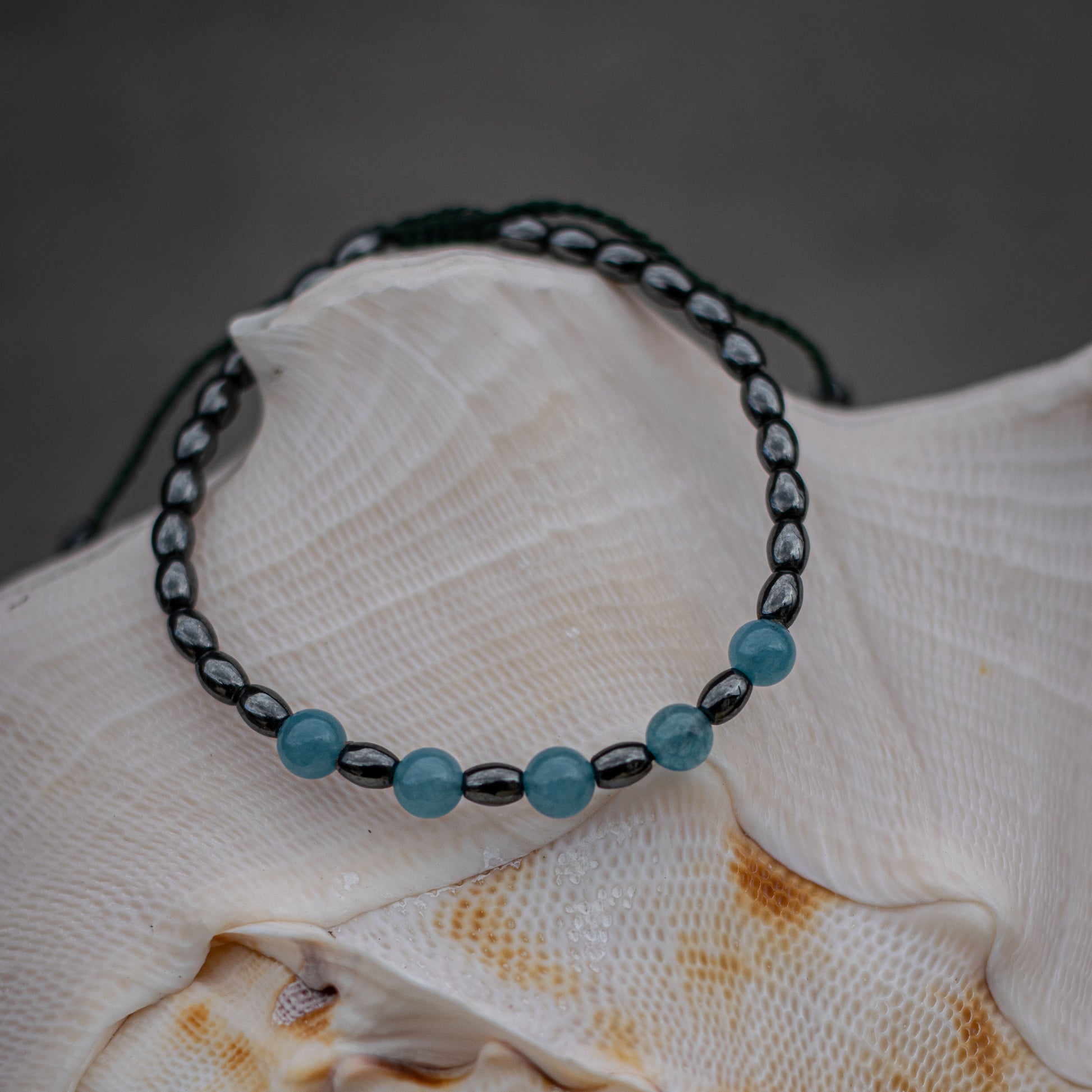 Υλικά: Χάντρες Μπλε Αχάτη, Χάντρες Αιματίτη, Κερωμένο Νήμα.